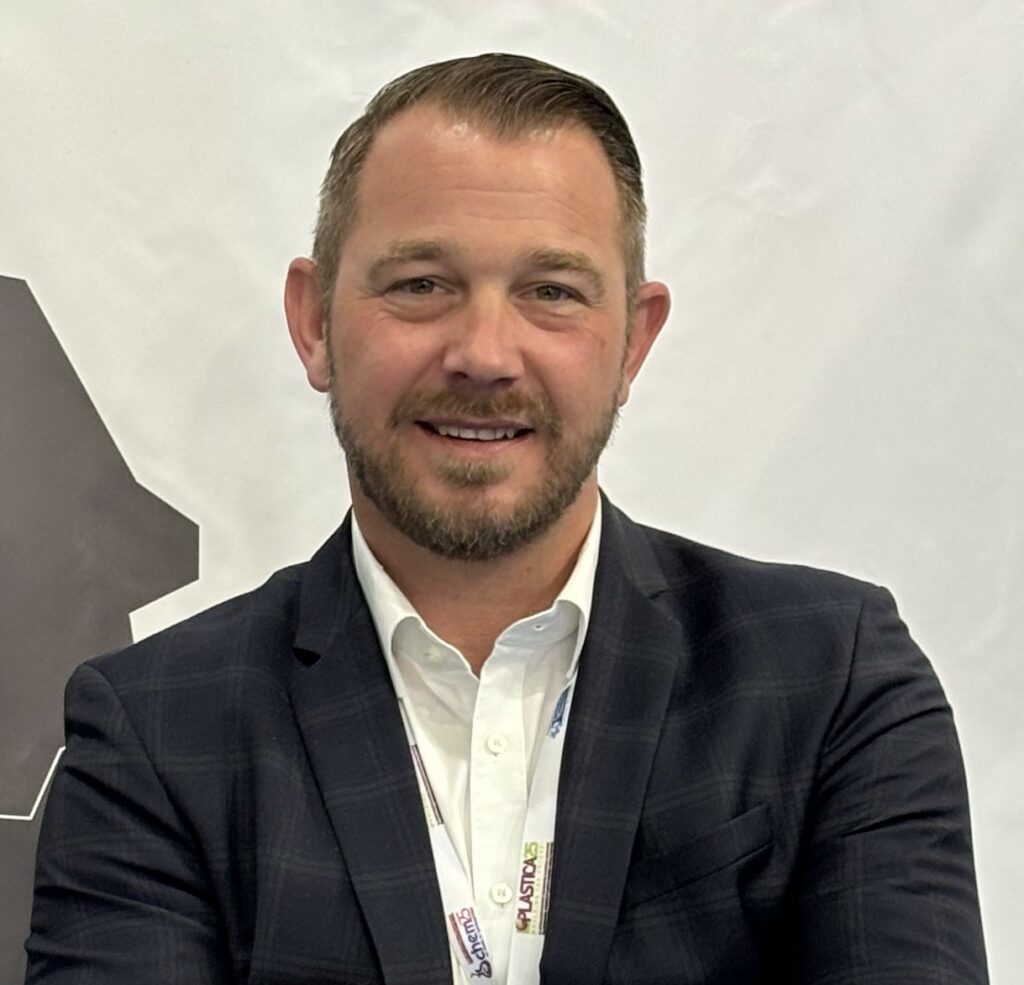 A person in a suit smiling, wearing a Plastoplan lanyard, against a plain backdrop.